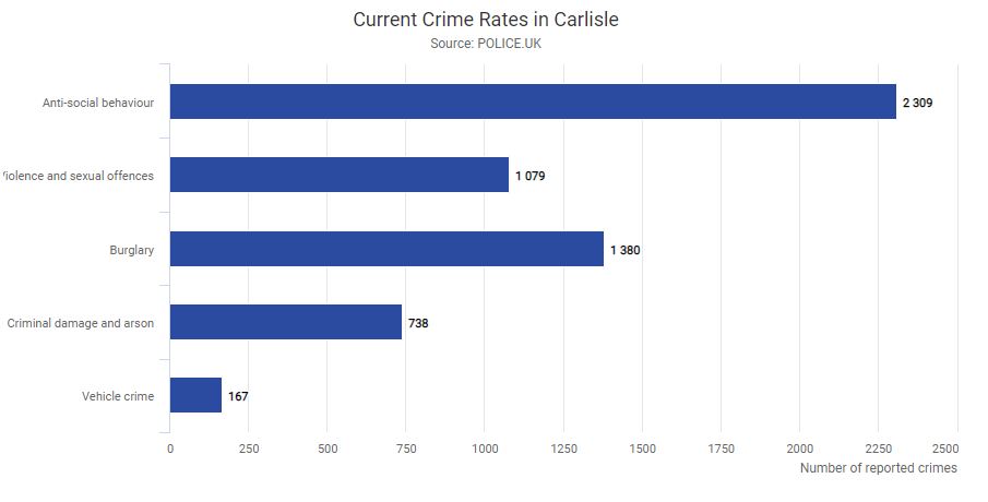 Over the last 12 months there have been 5673 reported crimes in the Carlisle area (figures compiled by combining the areas of Carlisle West).