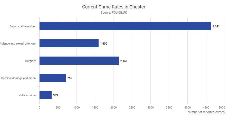 Over the last 12 months there have been 9441 reported crimes in the Chester area (figures compiled by combining the areas of Chester City, Chester North & Chester South).