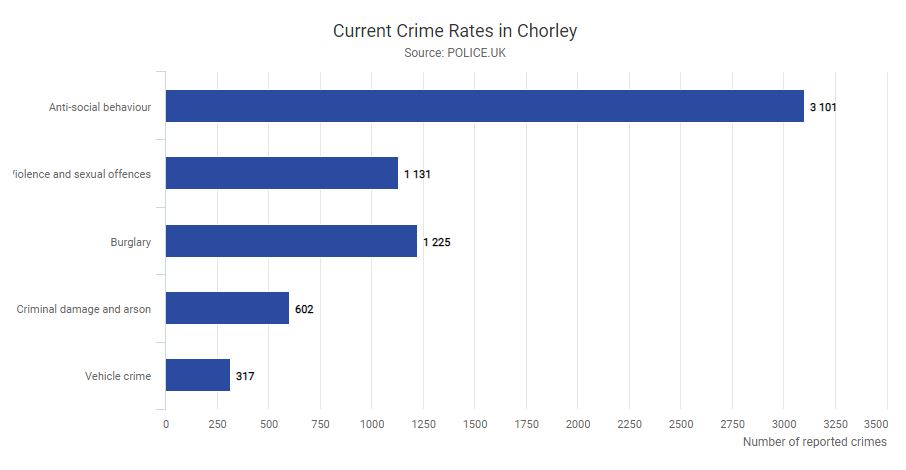 Over the last 12 months there have been 6378 reported crimes in the Chorley area (figures compiled by combining the areas of Chorley Rural West, Chorley South East & Chorley South West).