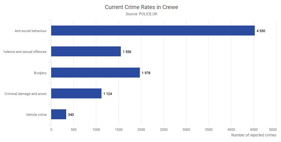 Over the last 12 months there have been 9531 reported crimes in the Crewe area (figures compiled by combining the areas of Crewe Centre, Crewe East & Crewe South).