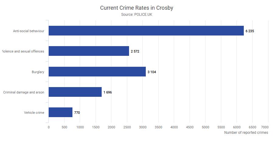 Over the last 12 months there have been 14377 reported crimes in the Crosby area (figures compiled by combining the areas of South Sefton and East Sefton).