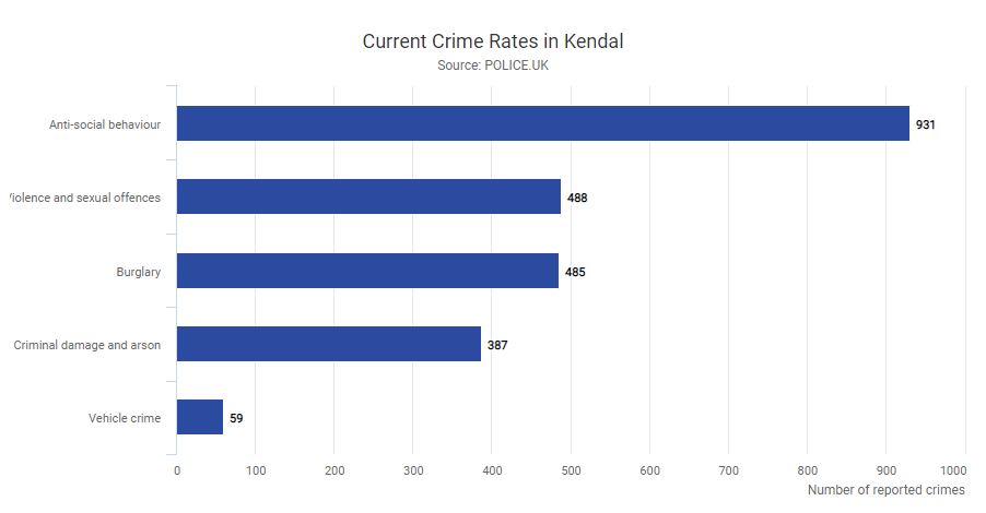 Over the last 12 months there have been 2350 reported crimes in the Kendal area (figures compiled by combining the areas of Kendal).