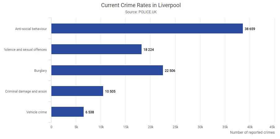 Over the last 12 months there have been 96432 reported crimes in the Liverpool area (figures compiled by combining the areas of City Centre, Everton, West Derby, Fazakerley, St Michaels, Belle Vale, Huyton, Old Swan, Kirkby, Prescot, Speke, Wavertree, Wallasey and Birkenhead).